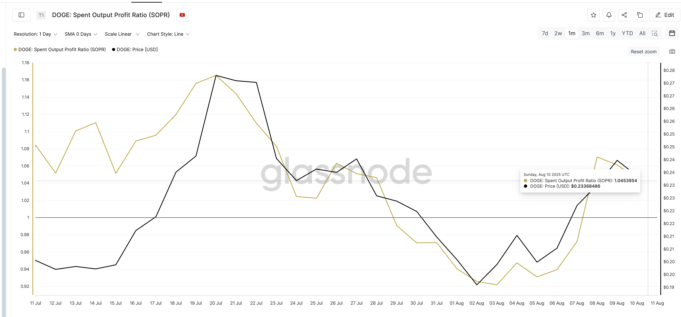 10 серпня SOPR DOGE піднявся до 1,045, близько до рівнів, що спостерігалися наприкінці липня, після чого відбулися швидкі відкати. Це свідчить про те, що ринок може наближатися до ще одного короткострокового періоду охолодження. Крім того, зростання SOPR узгоджується з наративом, орієнтованим на продаж.