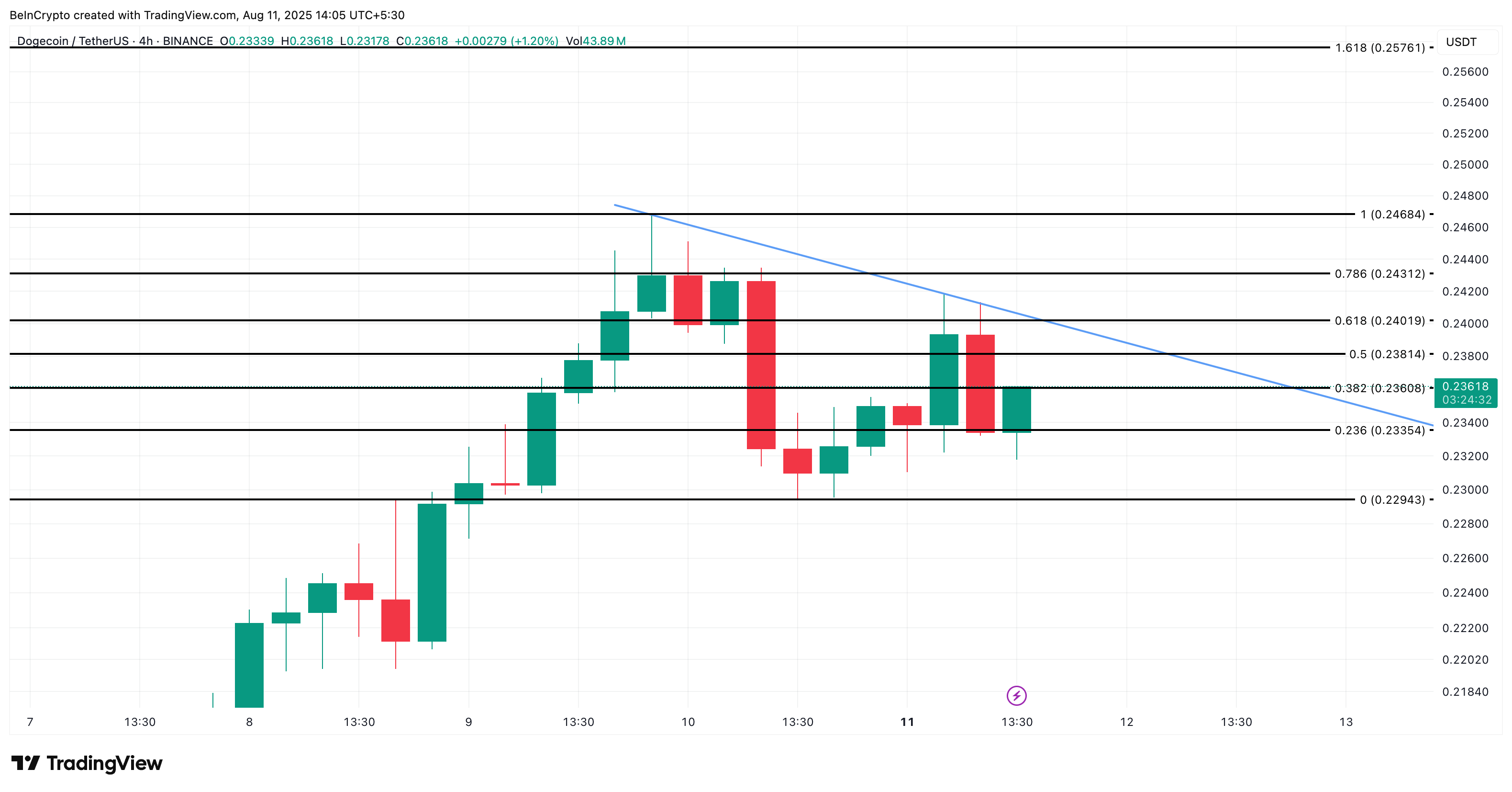 На 4-годинному графіку ціна DOGE коливається біля 0,235 доларів, трохи нижче спадної лінії тренду патерну низхідного трикутника. Ця конфігурація часто має ведмежий характер у короткострокових часових рамках, натякаючи на консолідацію, а не на прорив.