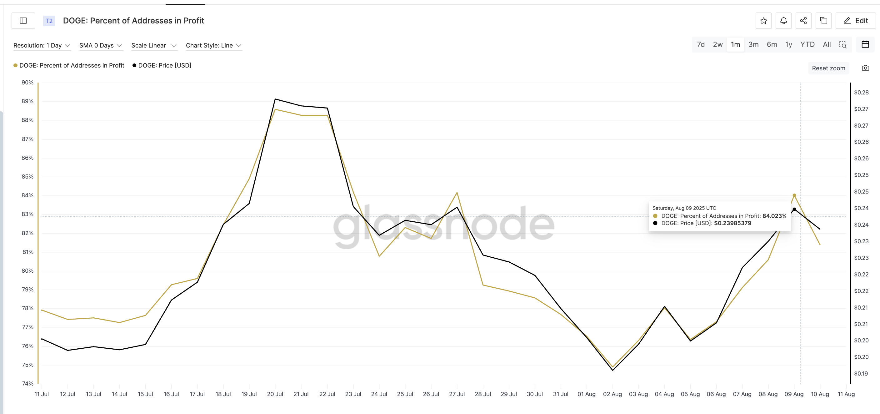 Відсоток адрес у прибутку для DOGE нещодавно досяг приблизно 84 %; це той самий рівень, що спостерігався 27 липня, перед тим як ціна впала з 0,24 доларів до 0,19 доларів лише за тиждень. Історично, коли занадто багато власників у прибутку, деякі схильні до продажу.