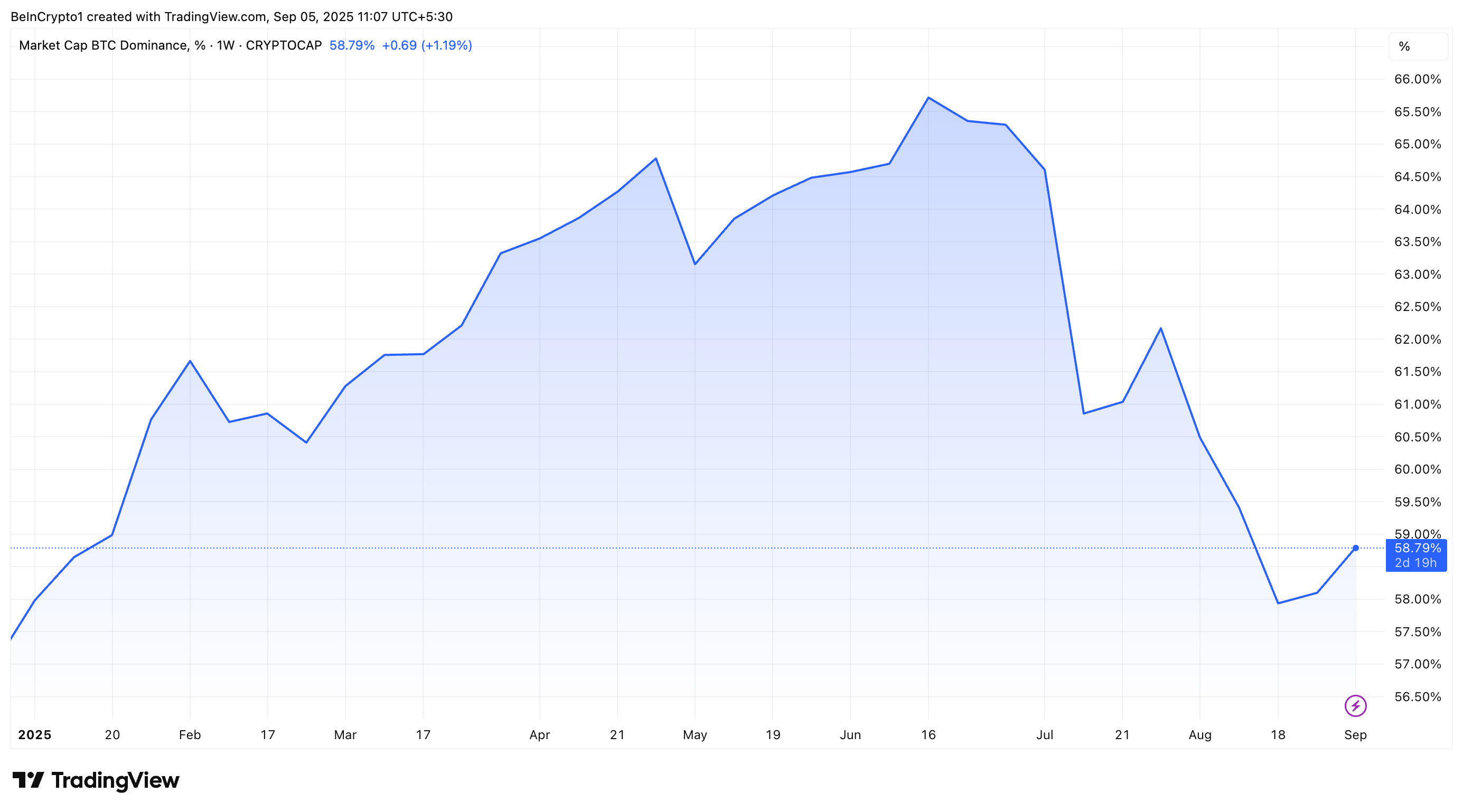 Домінування біткоїну (BTC. D), показник, що відображає частку Bitcoin у загальній капіталізації ринку криптовалют, знову демонструє ознаки відродження.