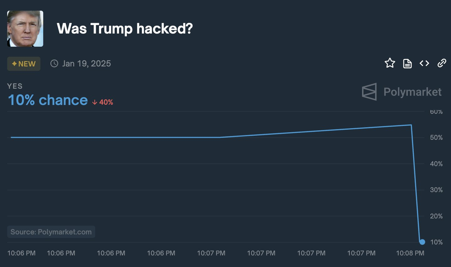 Також існують побоювання щодо можливого злому, адже випадки компрометації акаунтів у соціальних мережах стають дедалі частішими. Проте дані Polymarket свідчать лише про 10 % ймовірності того, що акаунти Трампа було зламано.