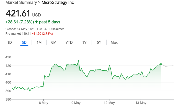 Цей графік показує, що ціна акцій Strategy Inc. зросла на 28,61 доларів, або на 7,28 %, за останні п’ять днів, закрившись на позначці 421,61 доларів 14 травня.