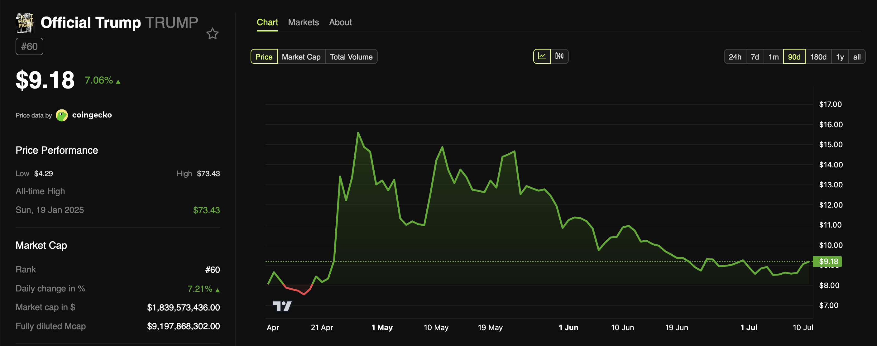 Незважаючи на це, обіцянка інвестицій Сана виявилася сприятливою для TRUMP. Дані BeInCrypto показали, що ціна зросла на 7 % за останні 24 години. На момент написання вона торгувалася на рівні 9,18 доларів.