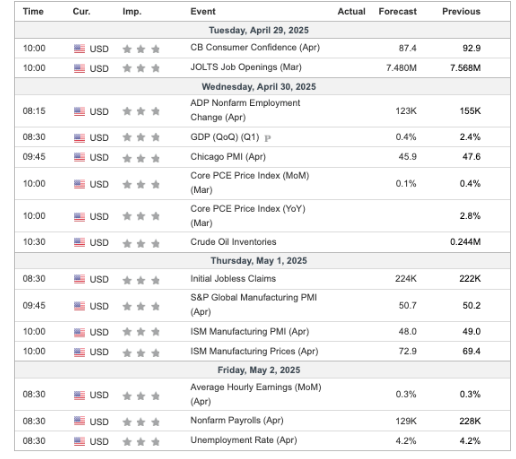 Звіт про несільськогосподарські робочі місця (NFP) буде оприлюднений у п’ятницю. Зростання на 228 000 робочих місць у березні 2025 року перевищило очікування, при цьому рівень безробіття становив 4,2 %.