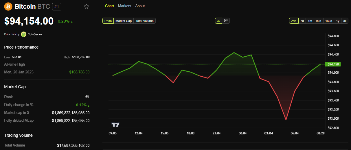 Дані BeInCrypto показують, що на момент написання біткоїн торгувався за 94 154 доларів, що на 0,29 % більше за останні 24 години.