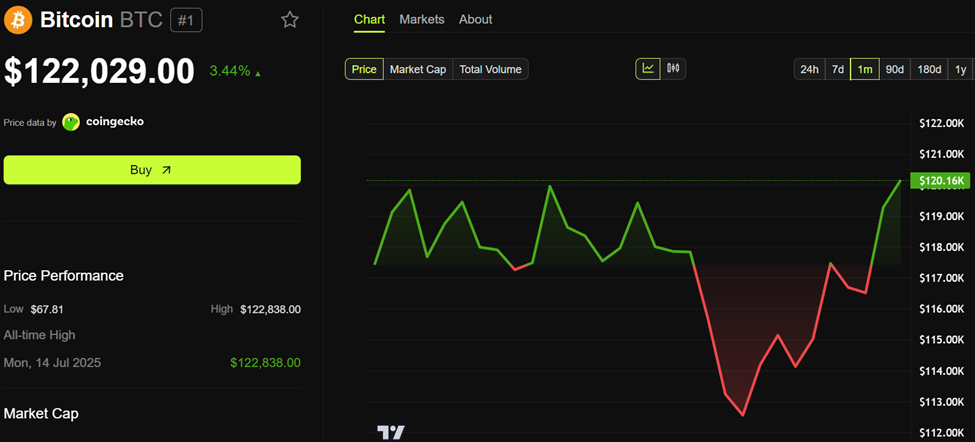 На момент написання, біткоїн торгувався за 122 029 доларів, що на 3,44 % більше за останні 24 години.