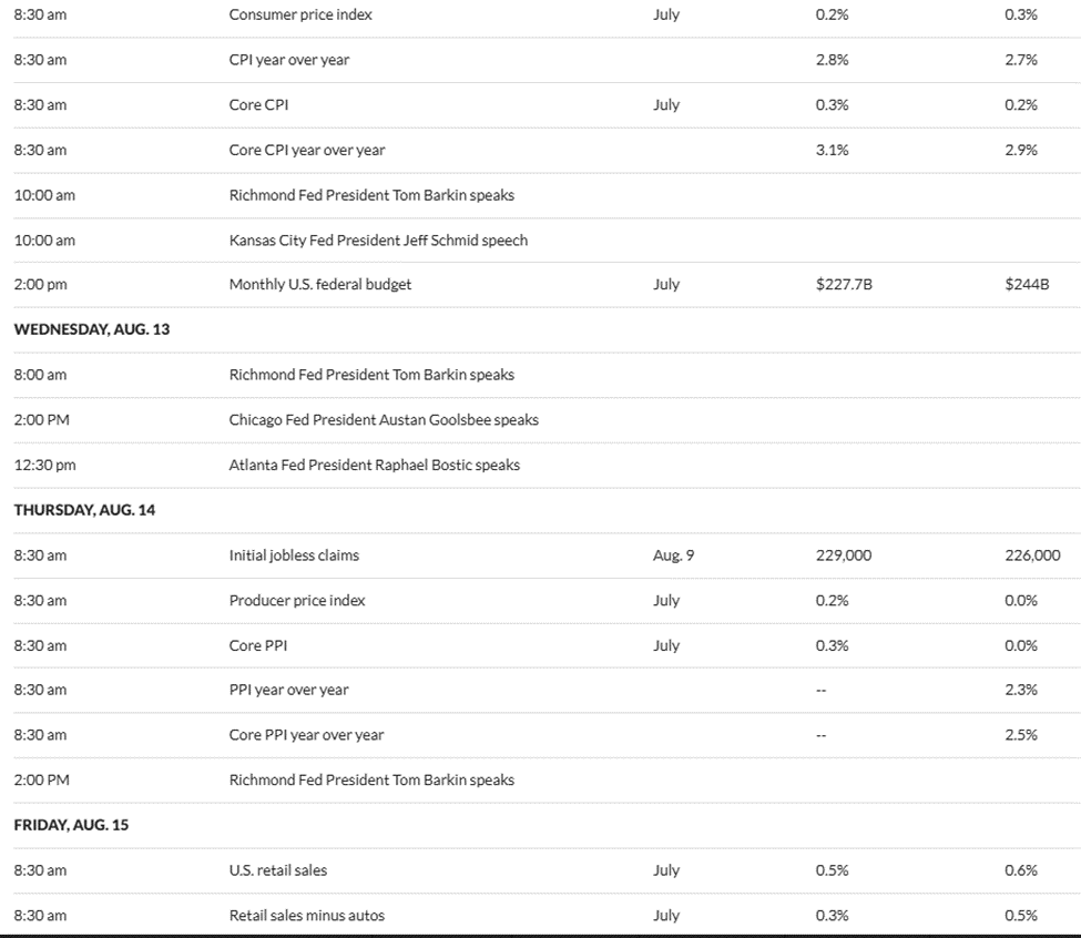 Інші економічні сигнали США цього тижня включають роздрібні продажі, які також є ключовим показником, з очікуванням слабких даних, що можуть посилити страхи рецесії. Бюро перепису населення США має оприлюднити цей показник у п’ятницю, 15 серпня, що відображає споживчі витрати, які становлять близько 70 % економіки США і впливають на ринковий настрій.