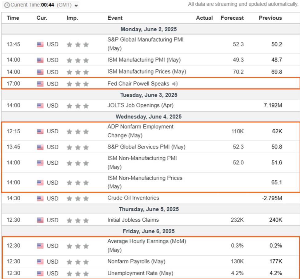 Ще один економічний індикатор США, на який варто звернути увагу цього тижня, — це звіт ADP про зайнятість за травень 2025 року, який буде опубліковано в середу, 4 червня. У квітні зайнятість у приватному секторі зросла на 62 000 робочих місць, що є значним уповільненням порівняно з переглянутим зростанням у березні на 147 000.