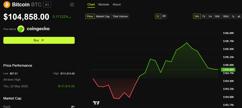 На момент написання, біткоїн торгувався за 104 858 доларів, після зростання на 0,17 % за останні 24 години.