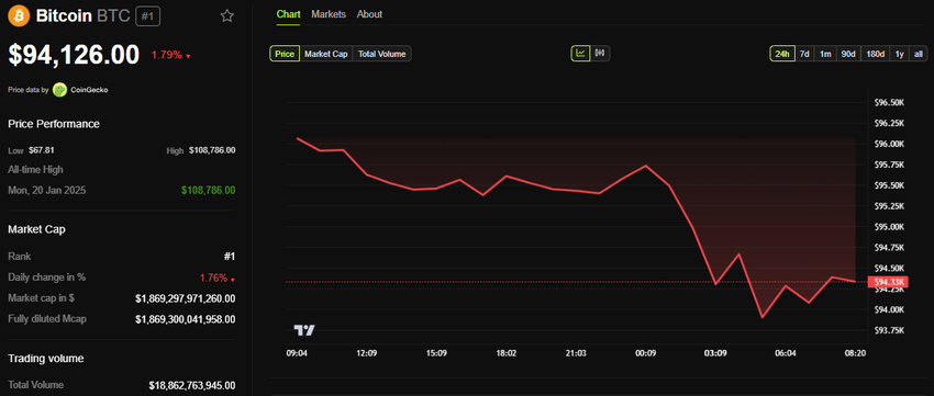 За даними BeInCrypto, біткоїн торгувався за 94 126 доларів на момент написання, знизившись майже на 2 % за останні 24 години.