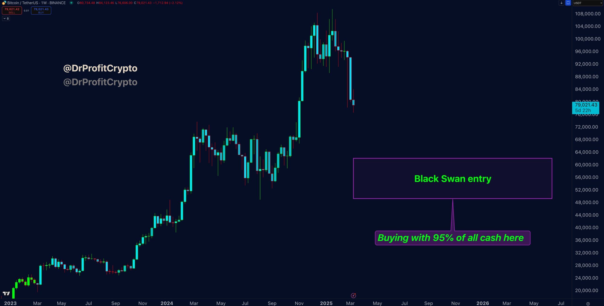 «Вхід у біткоїн – сценарій рецесії. Замовлення встановлені, готуємося полювати на свічки», — прокоментував Doctor Profit.