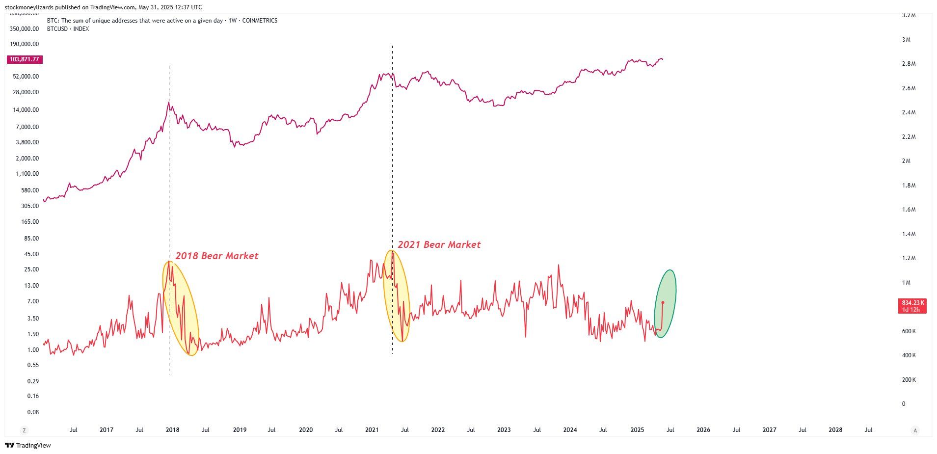 Окрім сумнівів у надійності технічних індикаторів, він також підкреслює деякі недооцінені позитивні сигнали. Наприклад, кількість активних адрес гаманців різко зросла, що свідчить про зростаючу участь як роздрібних, так і інституційних інвесторів.