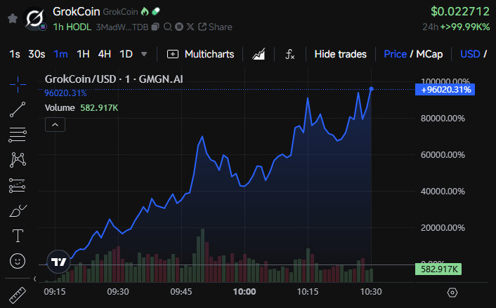 Невдовзі після цього ринкова капіталізація токена зросла до 12 мільйонів доларів із вражаючим обсягом торгів у 51,9 мільйона доларів. На момент публікації ринкова капіталізація GrokCoin перевищила 25 мільйонів доларів. Тим часом дані на GMGN показують, що вартість токена злетіла майже на 100 000%. Цей стрибок стався, коли необізнані інвестори вклалися в те, що, ймовірно, є спланованою схемою.
