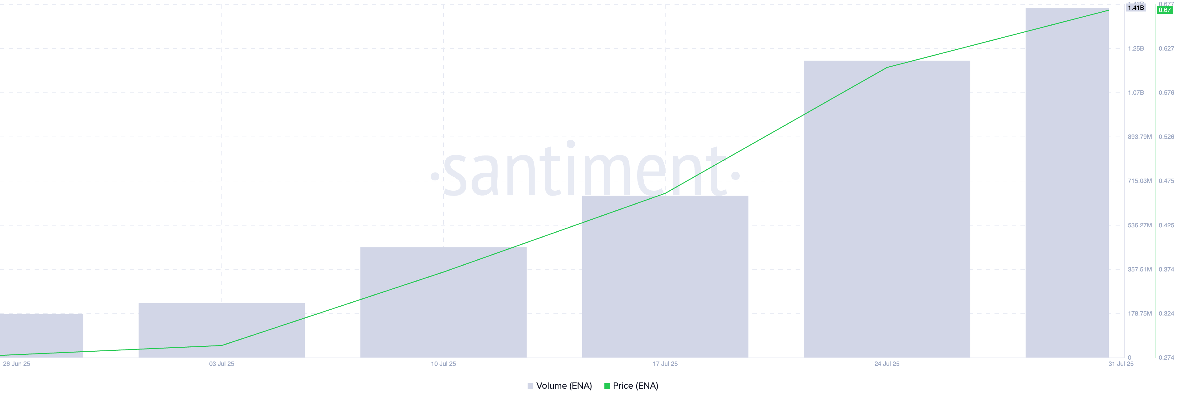 Згідно з ончейн-даними, недавнє зростання ENA обумовлене справжнім попитом, а не короткостроковим спекулятивним гайпом. За даними Santiment, тижневий обсяг торгів альткоїна зріс на понад 700 %, досягнувши 1,41 млрд доларів цього тижня — це його найвищий тижневий показник за понад рік.
