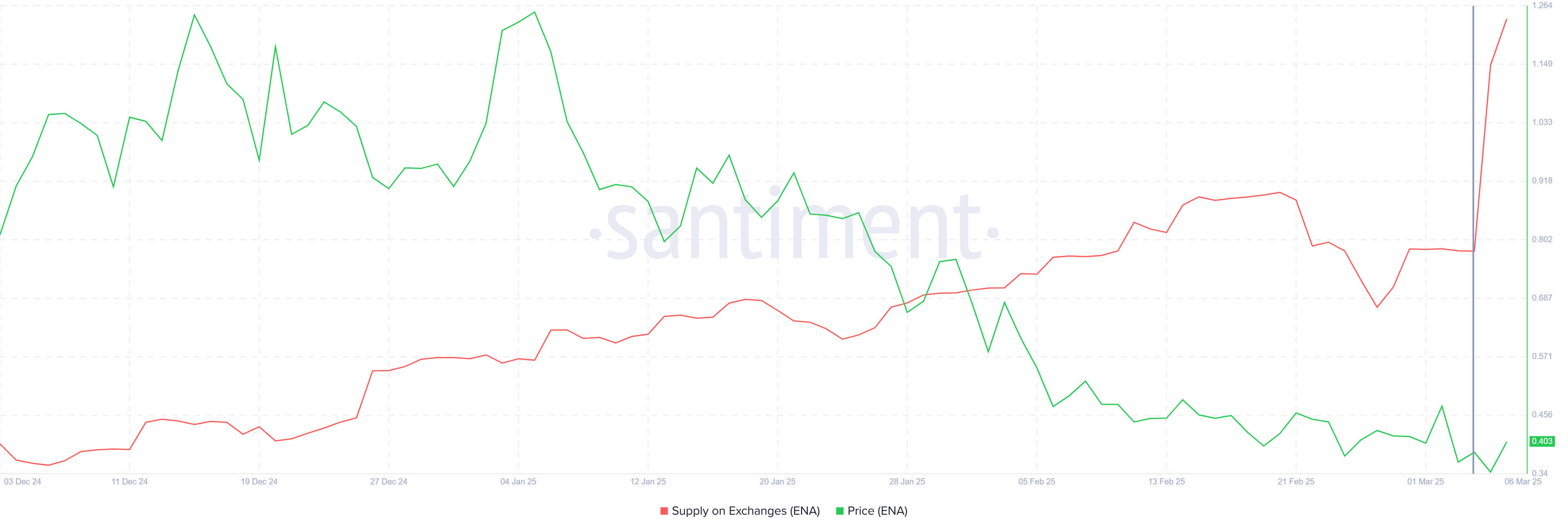 Ринкові настрої навколо Ethena характеризуються посиленою активністю продажів, особливо у дні, що передували розблокуванню токенів 5 березня. Протягом 24 годин до цієї події було продано приблизно 149 мільйонів токенів ENA, вартістю близько 60 мільйонів доларів.