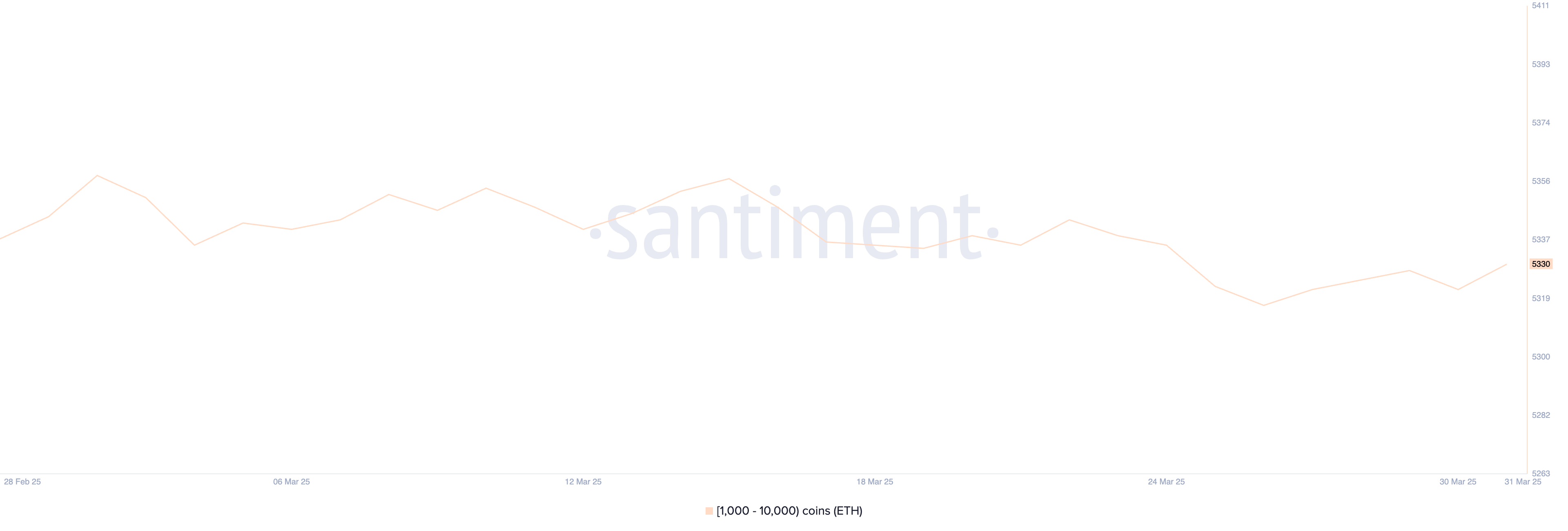 Кількість китів Ethereum — гаманців, що утримують від 1 000 до 10 000 ETH — трохи зросла, піднявшись з 5 322 до 5 330 за останні 24 години.