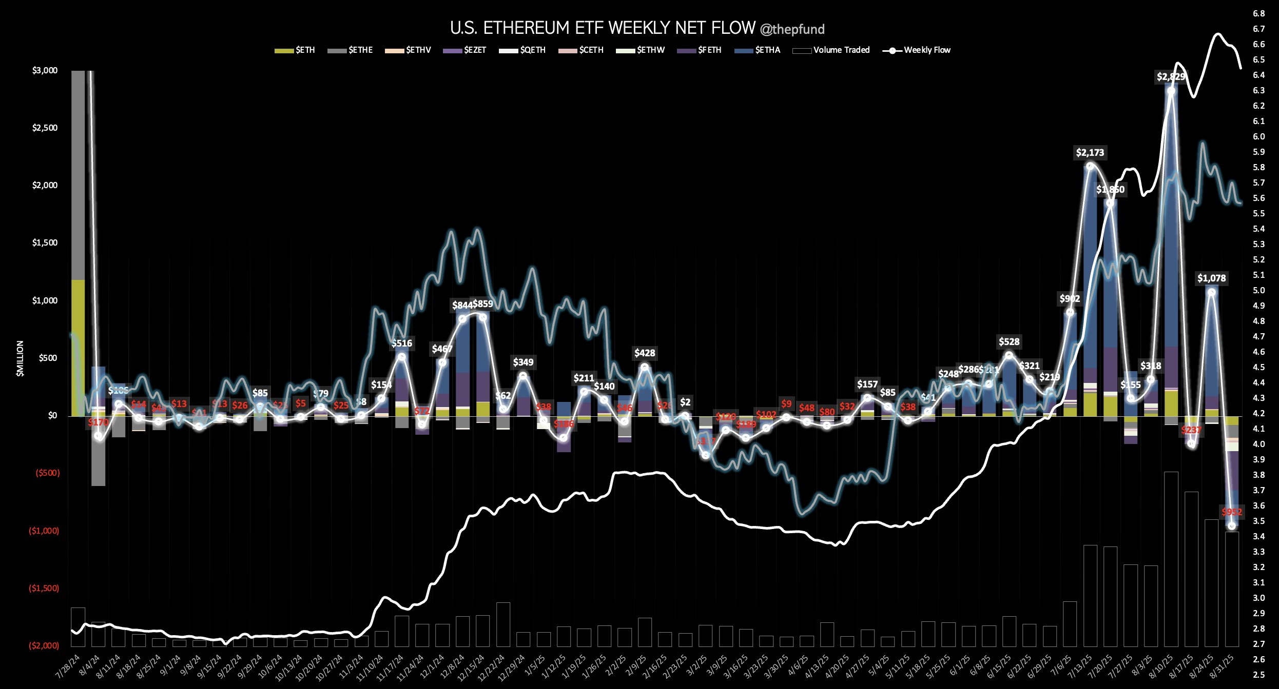 За цей період ETF Ethereum сукупно втратили понад 952 мільйони доларів, що стало найбільшим тижневим відтоком дев’яти фондів з моменту їх запуску.