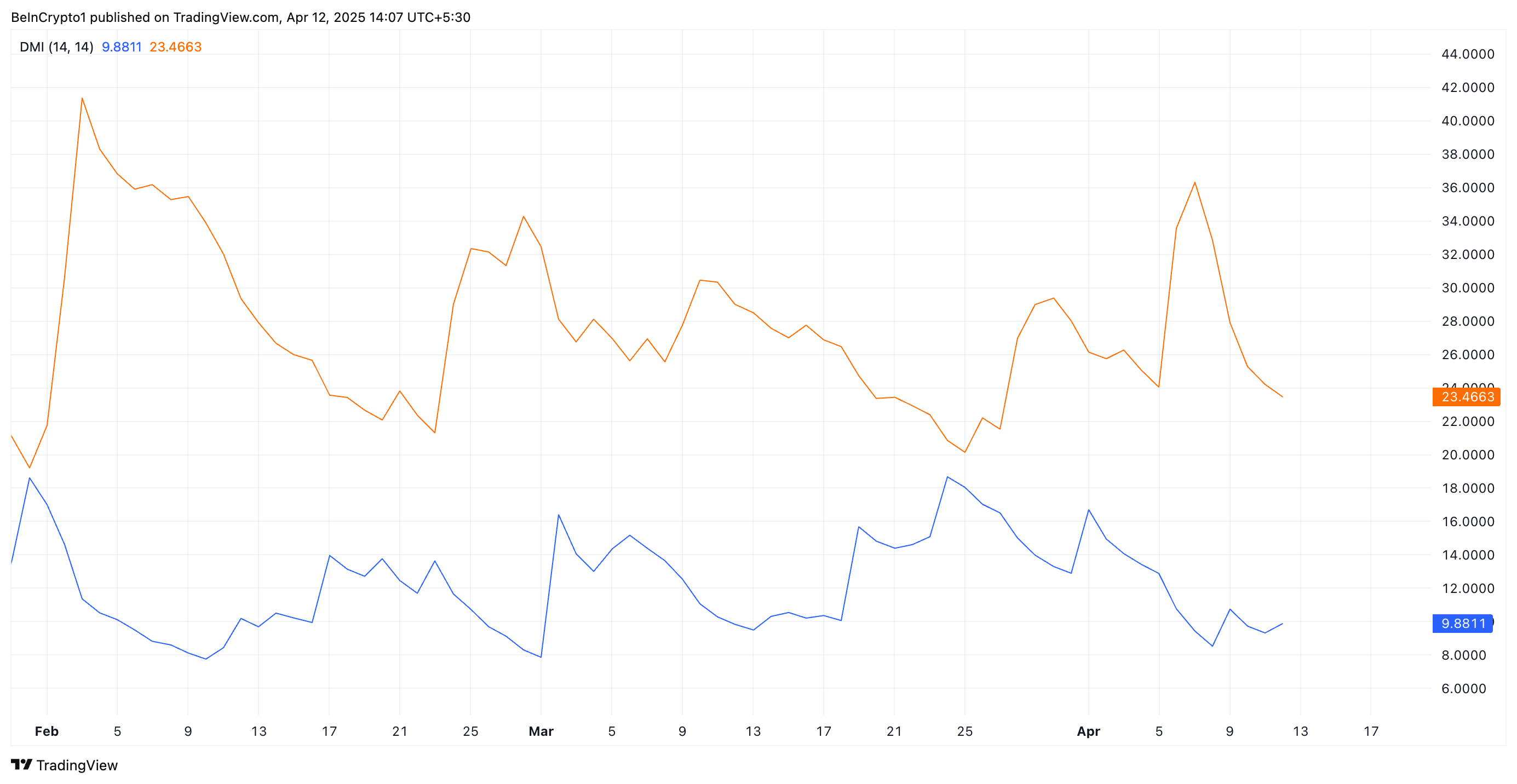 SponsoredІндикатор DMI вимірює силу цінового тренду активу. Він складається з двох ліній: +DI, яка представляє висхідний рух ціни, і -DI, яка представляє низхідний рух ціни.