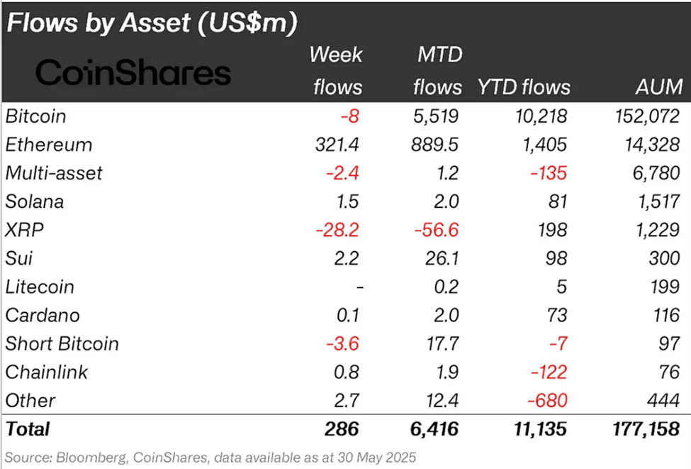 Інвестиційні продукти Ethereum (ETH) зафіксували найсильніший шеститижневий приплив з грудня 2024 року. Завдяки цьому припливу, криптовалютні інвестиції досягли 286 млн доларів минулого тижня.