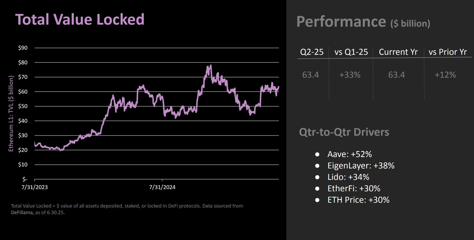 Згідно з даними звіту, загальна заблокована вартість (TVL) Ethereum зросла на 33 % у порівнянні з попереднім кварталом, досягнувши 63,4 млрд доларів. Це зростання було зумовлене значним збільшенням стейблкоїнів та реальних активів (RWA).
