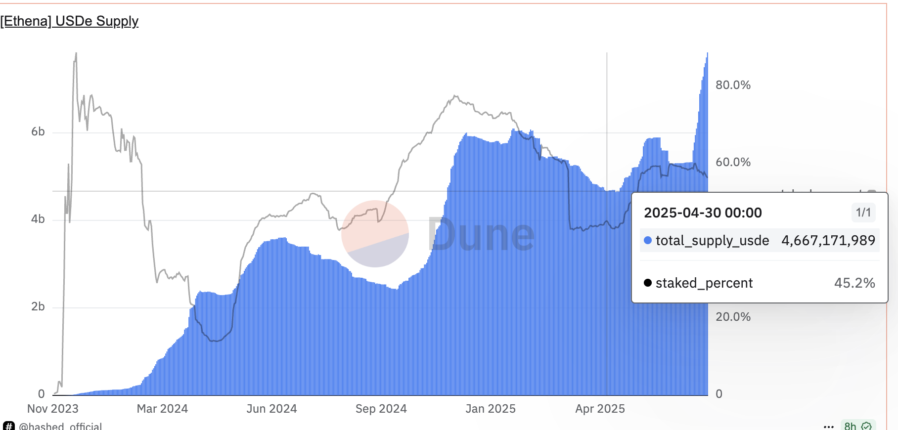 Загальна пропозиція USDe зросла майже на 80% з 30 квітня, піднявшись з приблизно 4,66 мільярда до понад 8,03 мільярда. Поряд з цим, відсоток застейканого USDe зріс з приблизно 45% до 56,3%, що свідчить про зростаючу впевненість у отриманні додаткових доходів від цих стабільних деривативів. Власний TVL Ethena (загальна заблокована вартість) зріс до 8,1 мільярда доларів, що відображає сильні капітальні надходження.