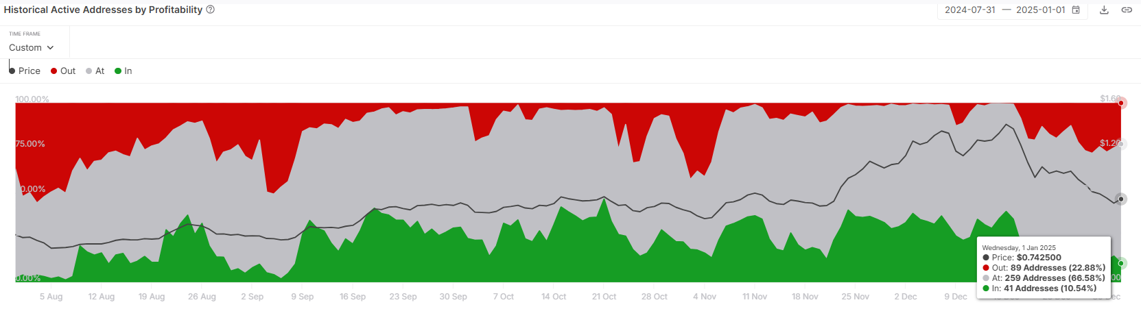 Дані про прибутковість активних адрес показують, що лише 10% учасників інвесторів FTM наразі в прибутку. Це найнижчий рівень для цієї групи, що свідчить про уповільнення активності продажу. Історично, коли прибутковість настільки низька, менше інвесторів схильні продавати, зменшуючи тиск на зниження ціни.