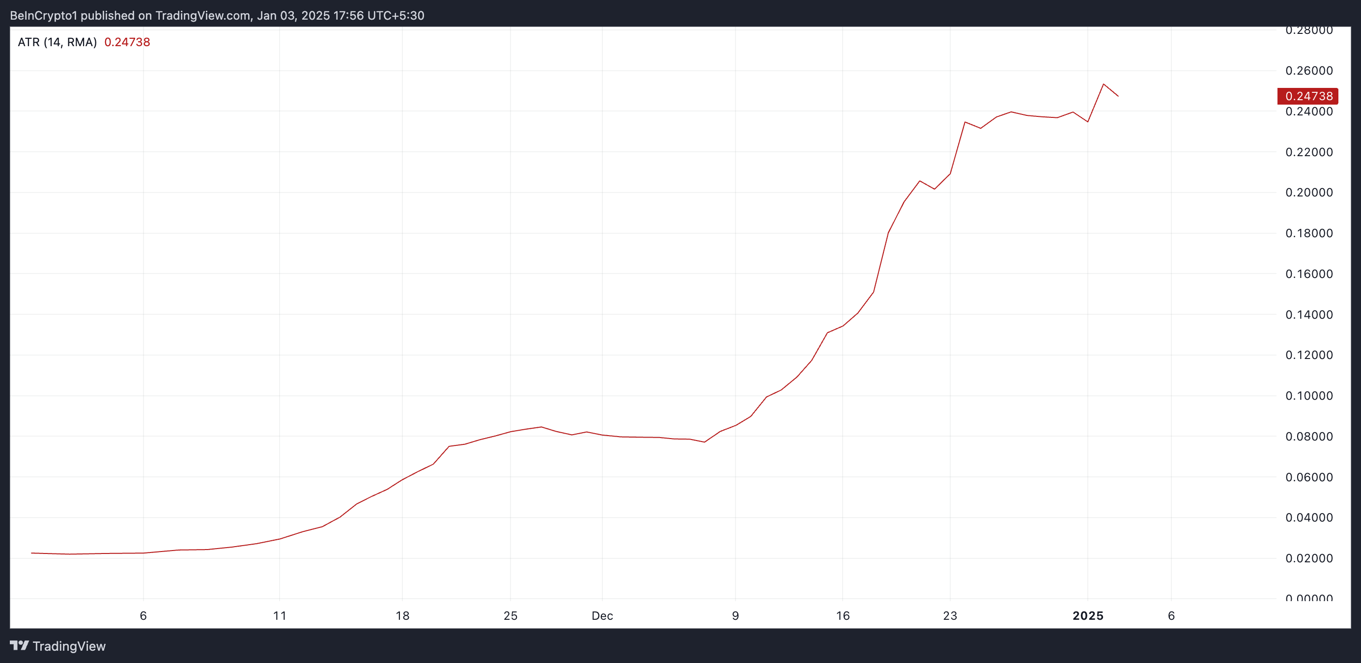 Крім того, середній істинний діапазон (ATR) FARTCOIN досяг історичного максимуму 0,25 2 січня, підтверджуючи сплеск волатильності ринку. На момент написання цього тексту індикатор становить 0,24.