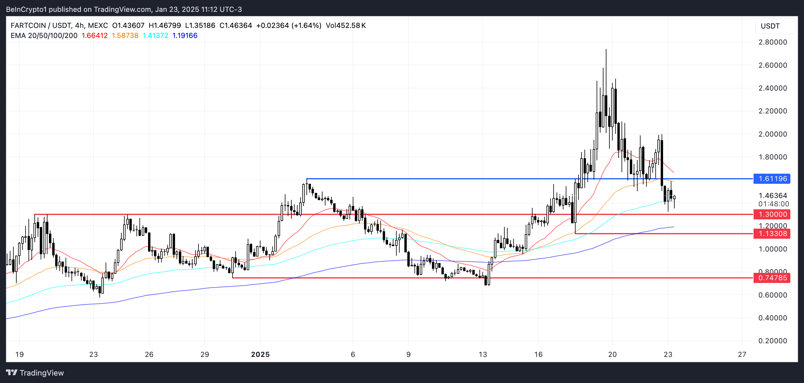 Прорив нижче ключових рівнів підтримки на $1,30 та $1,13 може прискорити падіння, потенційно знижуючи ціну FARTCOIN до $0,74 як наступної важливої зони підтримки, що може позбавити FARTCOIN статусу одного з 10 найбільших мемкоїнів.