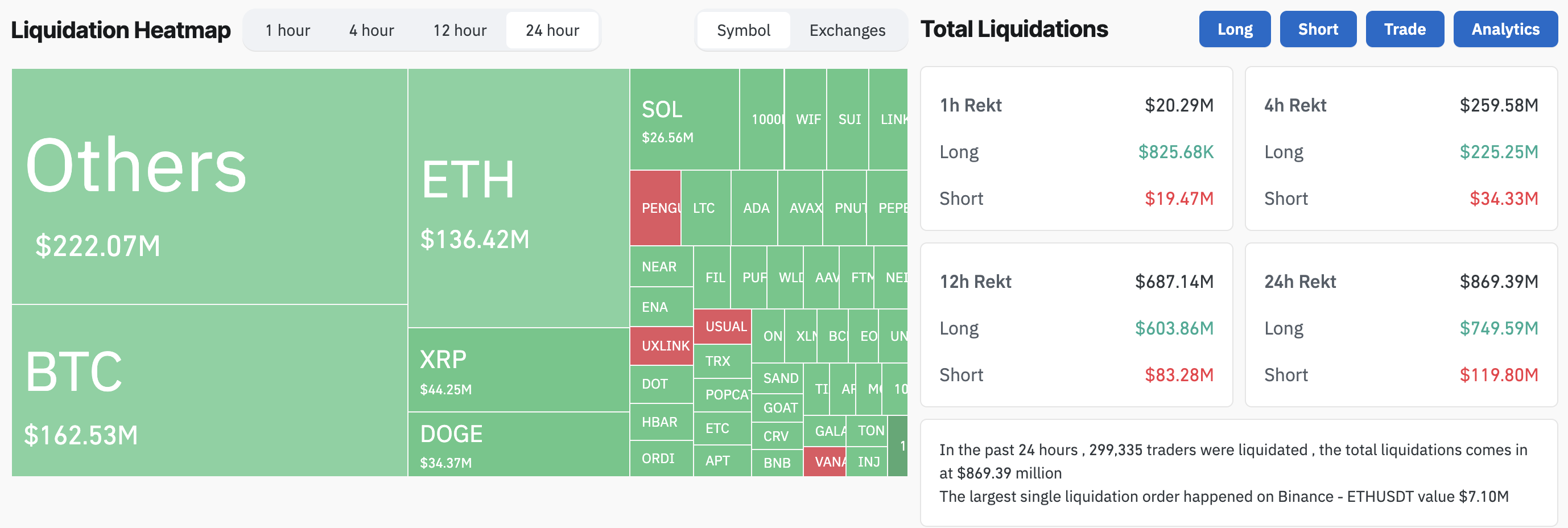 За даними Coinglass, за останні 24 години було ліквідовано $869,39 мільйонів, з яких $749,59 мільйонів припало на довгі позиції, а $119,80 мільйонів — на короткі. Особливо постраждали альткоїни, які склали понад $222 мільйони ліквідованих активів.