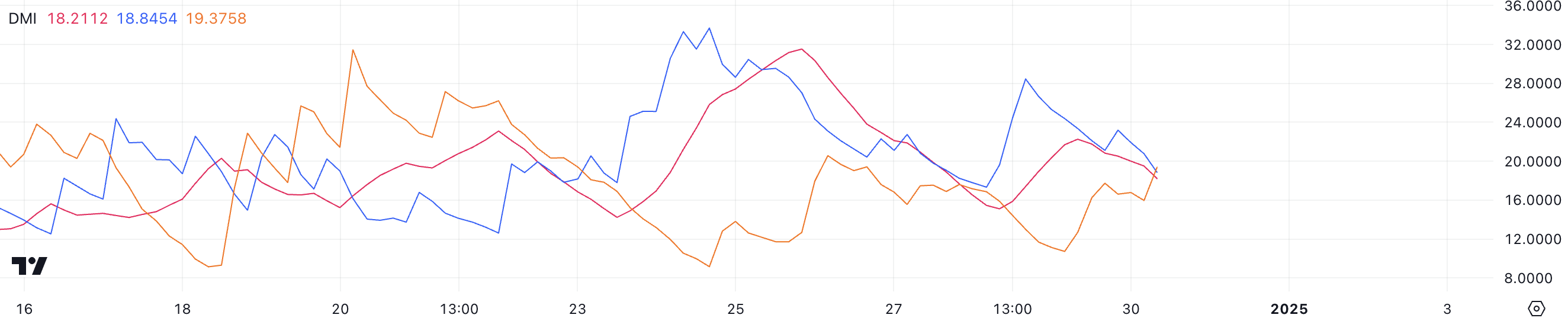 Hedera DMI графік показує, що його ADX наразі становить 18,2, що вказує на слабку силу тренду. +DI (Directional Indicator) становить 18,8, тоді як -DI трохи вищий на рівні 19,3, що показує, що ведмежий моментум залишається трохи домінуючим.