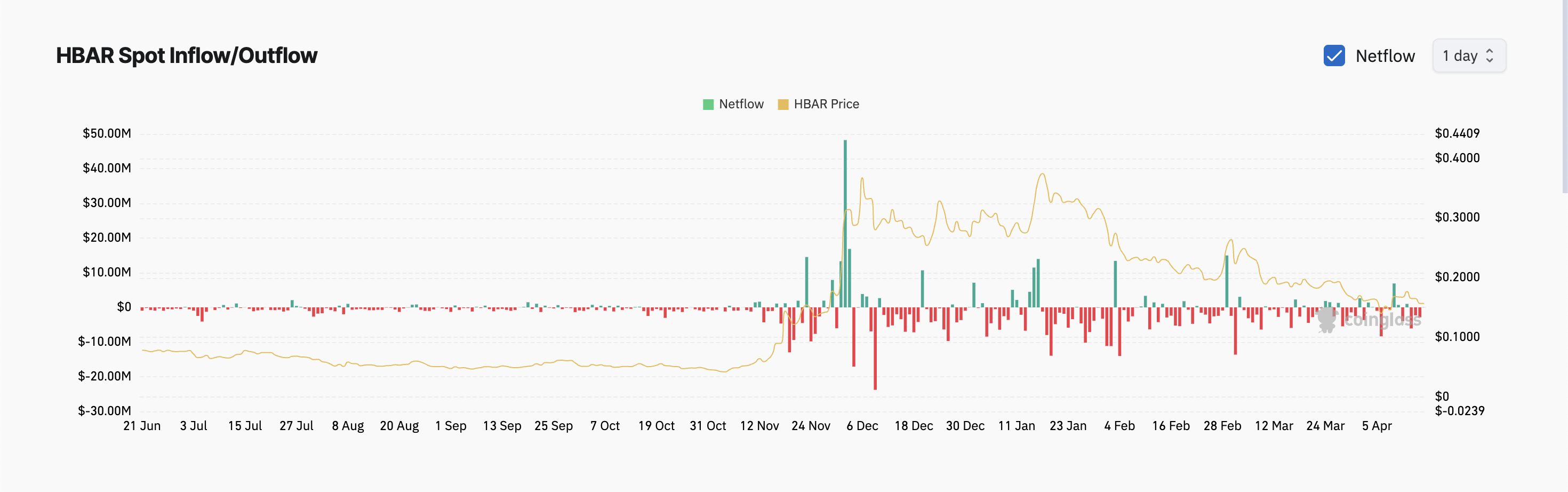 Стабільні щоденні відтоки з спотових ринків HBAR з початку квітня відображають зростаючу невизначеність і зміну настроїв ринку, оскільки трейдери все частіше прагнуть вийти зі своїх позицій.