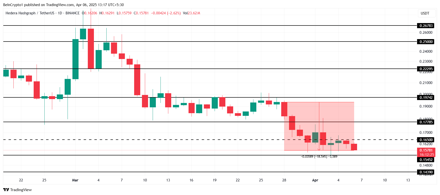 HBAR нещодавно зазнав значної корекції ціни, що призвело до зниження альткоїна до критичного рівня підтримки. Оскільки ринкові умови продовжують демонструвати слабкість, цінова динаміка залишила HBAR вразливим.