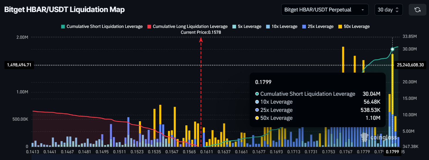 Карта ліквідацій вказує на ситуацію занепокоєння для коротких трейдерів. Приблизно 30 мільйонів доларів коротких контрактів готові до ліквідації, якщо ціна HBAR зросте до 0,18 доларів. Це може спричинити величезні втрати для трейдерів, які ставлять проти активу. Проте, поточний ціновий діапазон біля 0,157 доларів надав певне полегшення, оскільки ринок намагається пробити нижчі рівні підтримки.