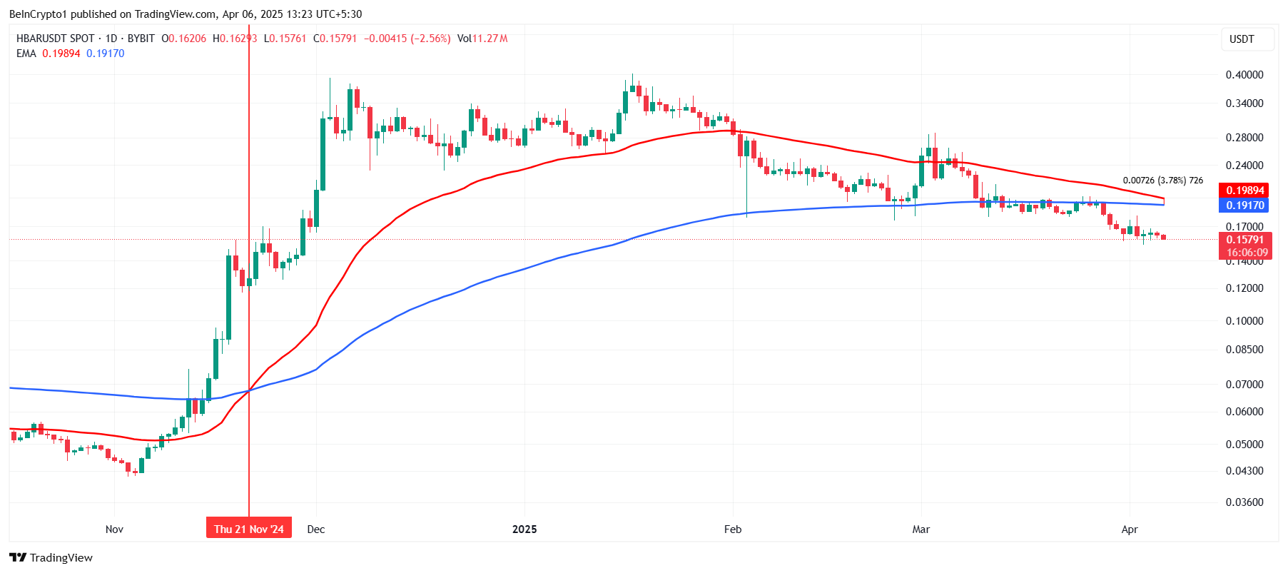 Загальний макроімпульс для HBAR показує ознаки потенційного тиску вниз, оскільки криптовалюта наближається до смертельного хреста. 200-денна експоненційна ковзна середня (EMA) знаходиться лише на відстані понад 3% від перетину з 50-денною EMA.