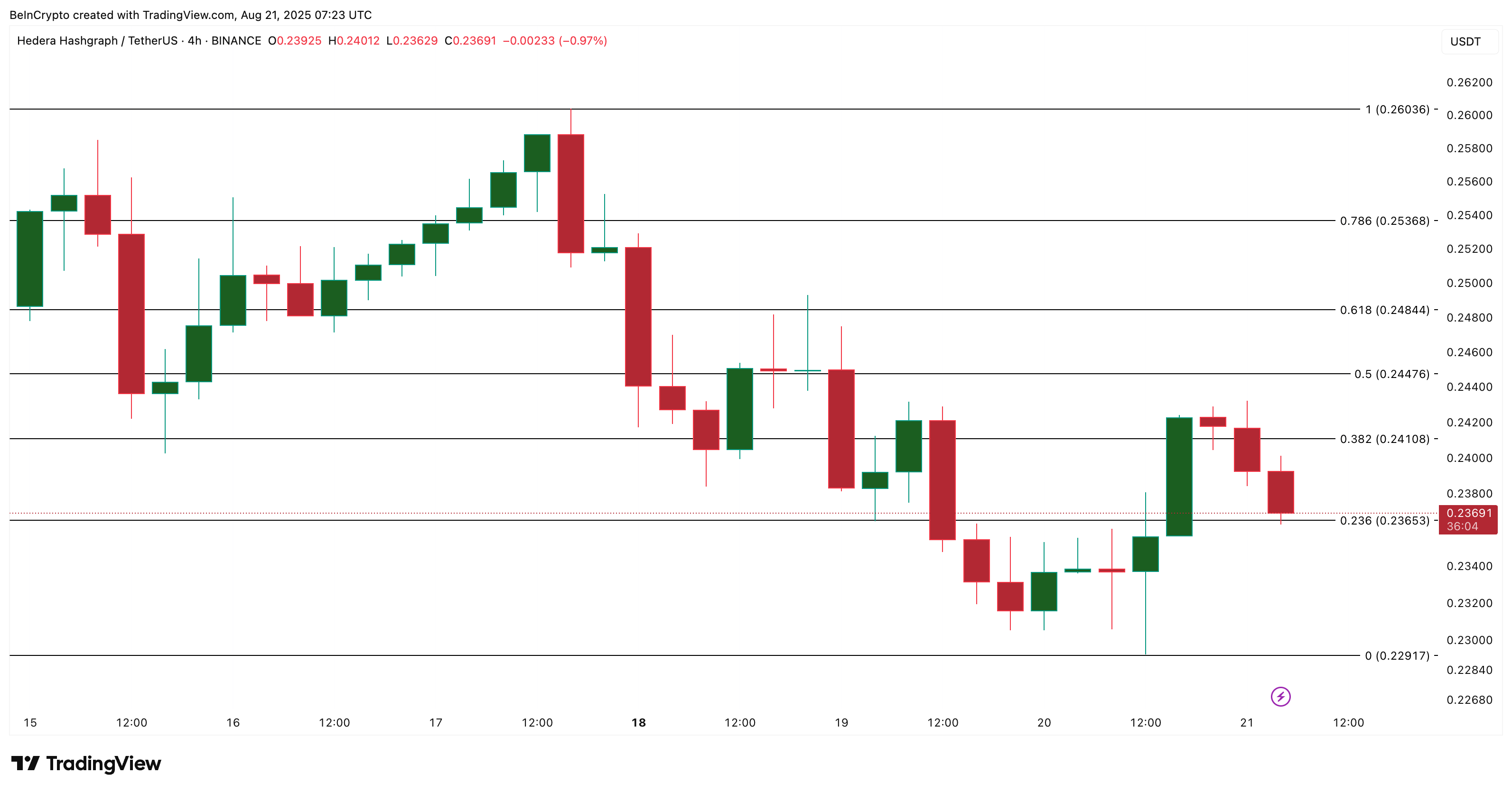 На 4-годинному таймфреймі ціна HBAR коливається в межах вузького діапазону між 0,236 і 0,241 доларів. Токену важко утриматися вище цієї зони.