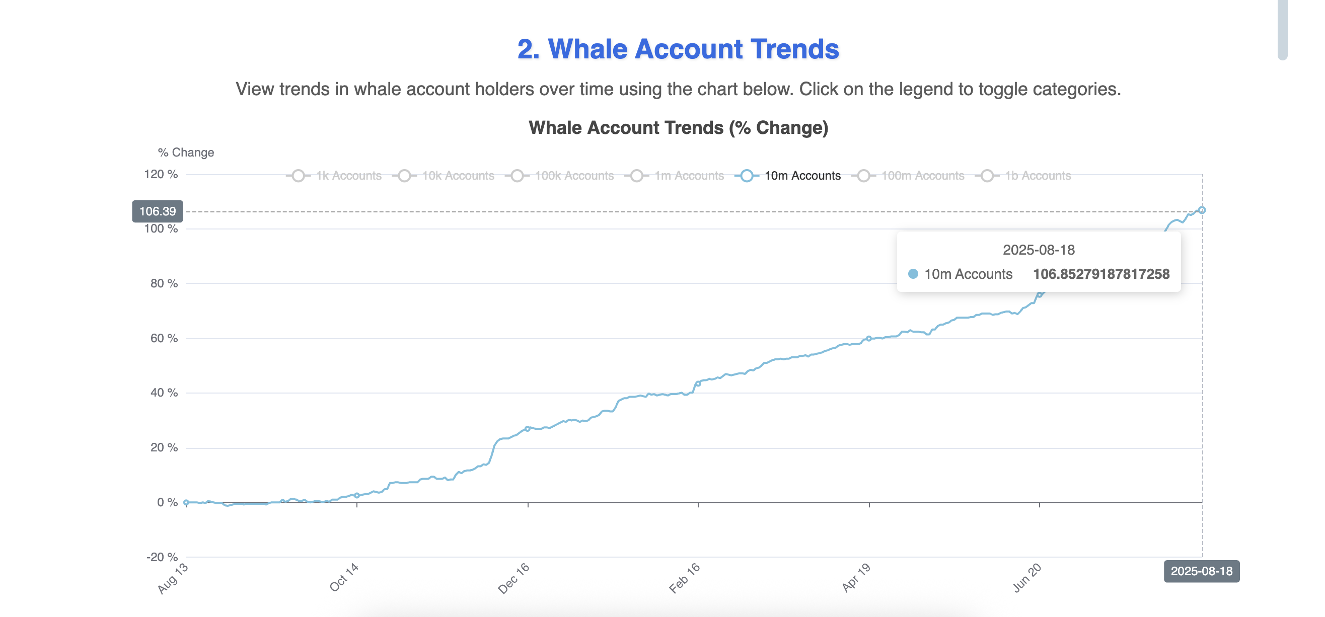 Між 11 серпня та 18 серпня кількість гаманців, що містять 10 мільйонів або більше HBAR, зросла з 102,28 до 106,85; це підвищення на 4,57 гаманця, що означає принаймні 45,7 мільйона HBAR у чистому накопиченні.