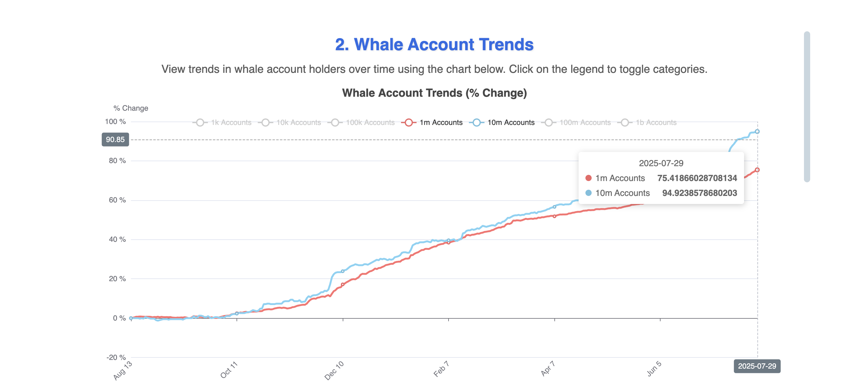 Ціна HBAR може бути нижчою за свій максимум у 0,30 доларів, але великі гравці бачать у цьому можливість купити на падінні. З 20 липня кількість гаманців, що містять щонайменше 1 мільйон HBAR, зросла майже на 5 %, а тих, що мають 10 мільйонів або більше, збільшилася майже на 4,5 %. Така активність з боку китів зазвичай сигналізує про тихе накопичення, а не паніку.