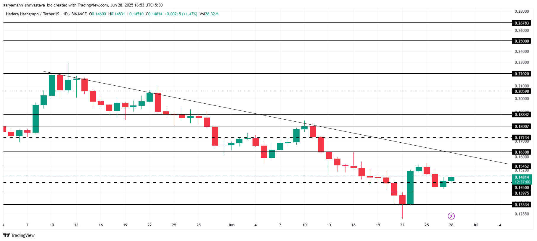 На момент написання, HBAR торгується на рівні 0,148 доларів, трохи нижче критичного рівня опору 0,154 доларів. Альткоїн намагається подолати цей опір і прорвати спадну лінію, яка його стримує.