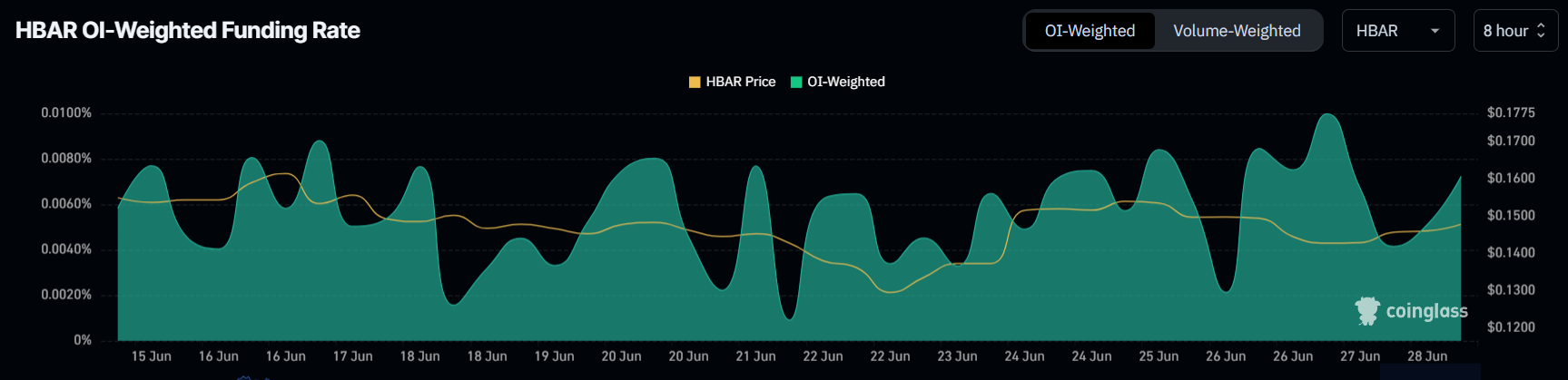 Протягом цього місяця трейдери демонстрували сильний бичачий настрій щодо HBAR. Ставка фінансування залишалася позитивною постійно, що свідчить про домінування довгих контрактів на ринку.