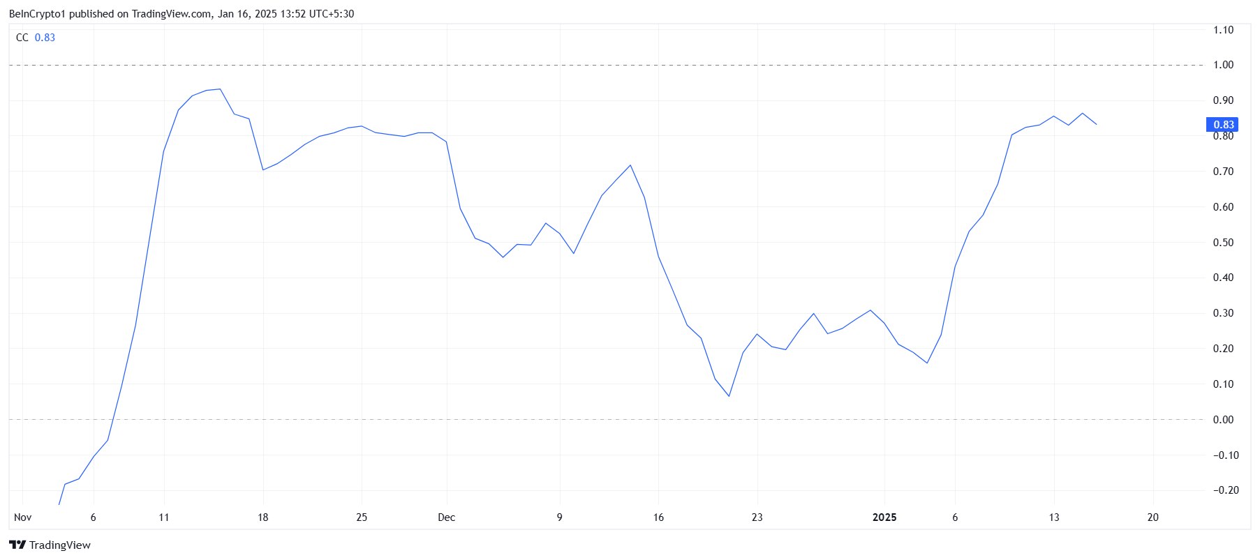 Кореляція HBAR з біткоїном залишається сильною на рівні 0,88, що вказує на те, що рух ціни альткоїна тісно пов’язаний з траєкторією біткоїна. Це обнадійливий знак, оскільки біткоїн на межі повернення до критичного рівня 100 000 доларів, що може посилити оптимізм для ширшого крипторинку, включаючи HBAR.