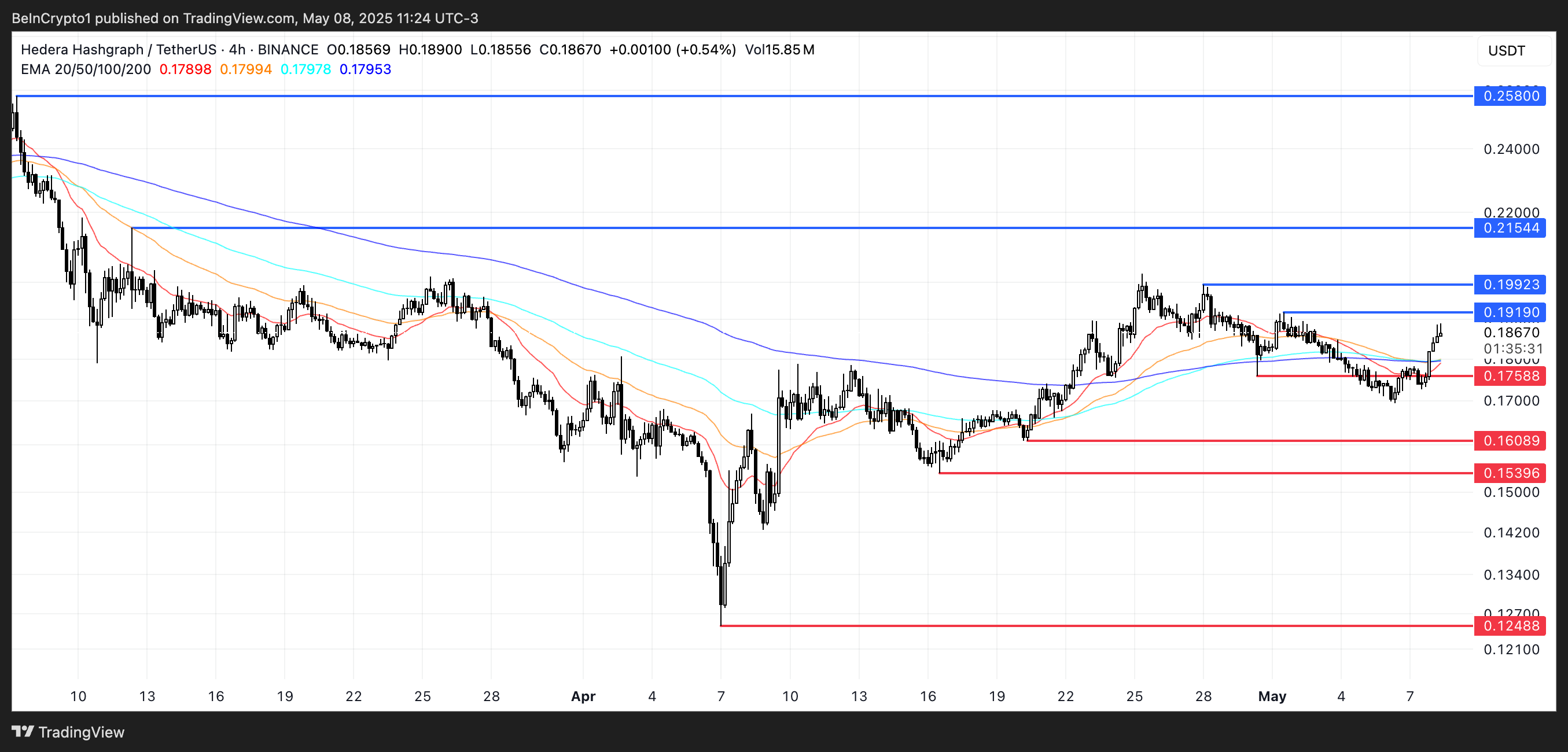 Sponsored SponsoredЦя конфігурація зазвичай вважається бичачою, що свідчить про те, що висхідний моментум може незабаром посилитися. Якщо золотий перетин підтвердиться і ціна Hedera прорветься вище рівнів опору 0,191 і 0,199 доларів, наступними цілями можуть стати 0,215 і 0,258 доларів.