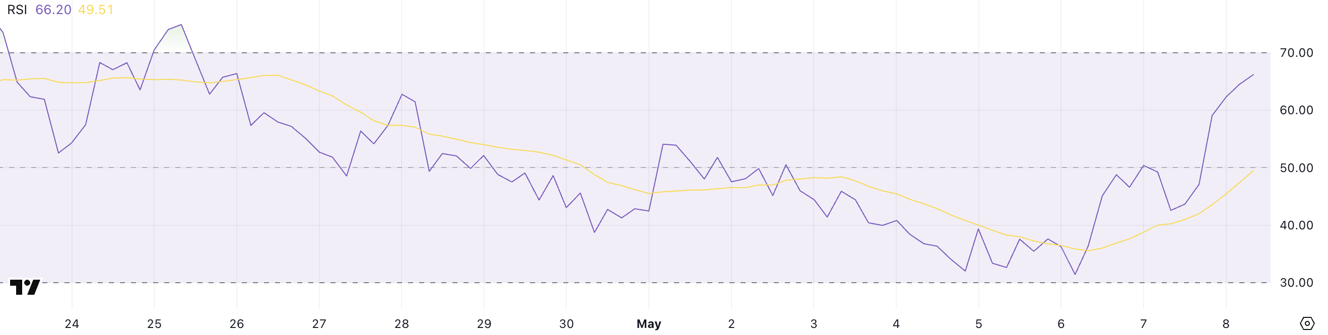 Індекс відносної сили (RSI) для Hedera зріс до 66,2, різко піднявшись з 31,41 лише два дні тому.
