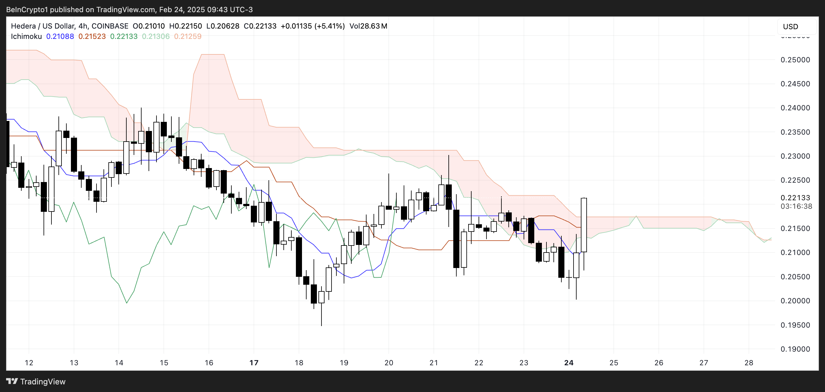 Хмара Ічімоку для HBAR вказує на можливе формування бичачого тренду, але він ще не встановлений