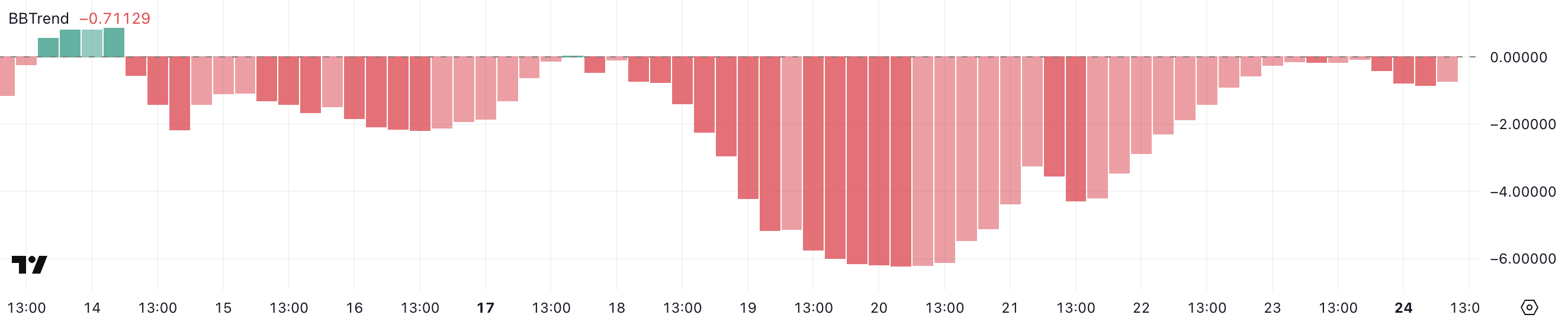 BBTrend, або тренд смуг Боллінджера, вимірює моментум і напрямок руху ціни відносно смуг Боллінджера. Негативне значення свідчить про те, що ціна рухається до нижньої смуги, сигналізуючи про ведмежі настрої, тоді як позитивне значення вказує на бичачий моментум до верхньої смуги.