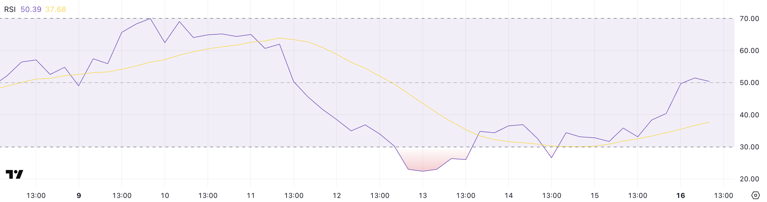Hedera демонструє помітну зміну імпульсу, оскільки її індекс відносної сили (RSI) піднявся до 50,39, значно зросши з 26,6 лише два дні тому.