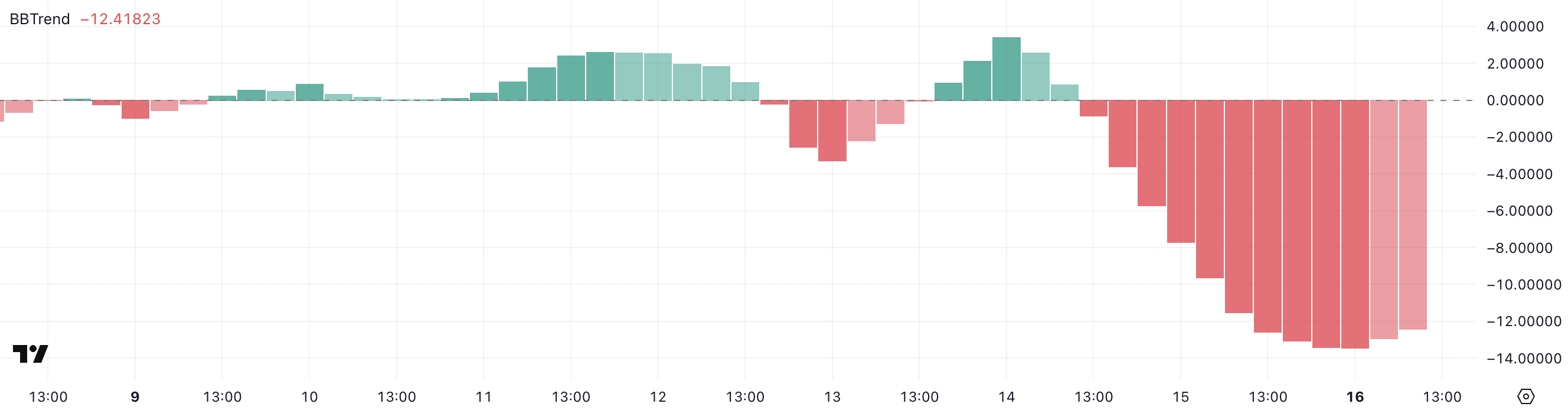 Hedera демонструє ознаки ослаблення імпульсу, оскільки її BBTrend різко знизився до -12,41, знизившись з -0,83 лише два дні тому.
