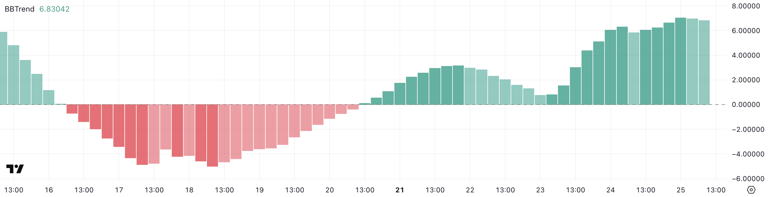 BBTrend, скорочено від Bollinger Band Trend, є показником, що виводиться з смуг Боллінджера і вимірює силу та напрямок тренду. Значення нижче одного зазвичай відображають слабкий або плоский ринок, тоді як значення вище 3 вказують на виникнення сильного тренду.