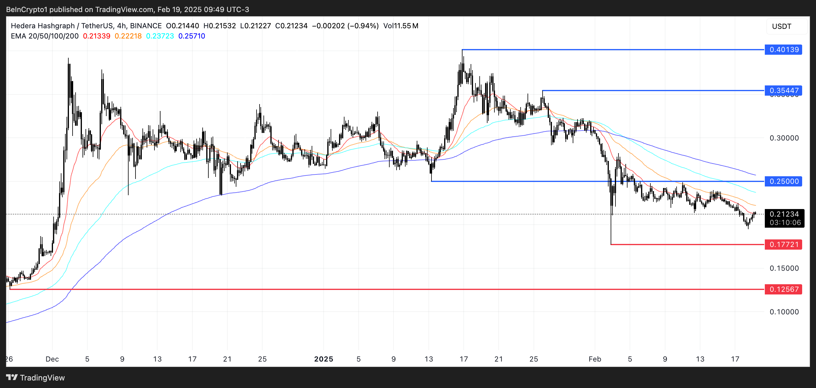 Hedera (HBAR) піднявся вище 0,21 доларів за останні 24 години. Однак він все ще намагається відновитися після 40% корекції за останні 30 днів. Незважаючи на це короткострокове відновлення, технічні індикатори свідчать про те, що ведмежий моментум залишається під контролем.