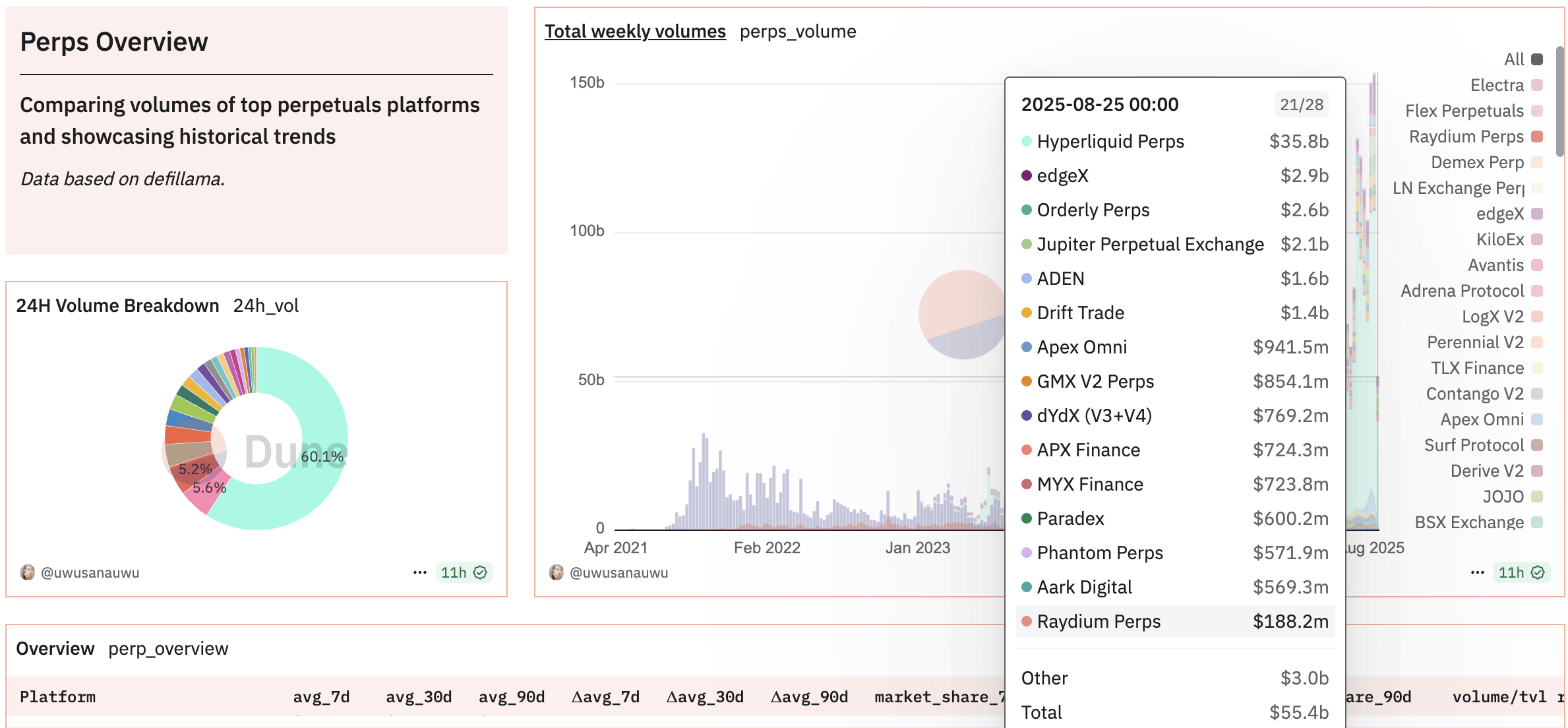 Хоча це може здатися амбітним, це відображає ширшу думку про те, що Hyperliquid може отримати вигоду від мережевих ефектів у міру розширення частки ринку безстрокових платежів у мережі. Дані Dune показують, що Hyperliquid наразі знаходиться на вершині рейтингу DEX із загальним тижневим обсягом торгів понад 35,8 мільярда доларів.