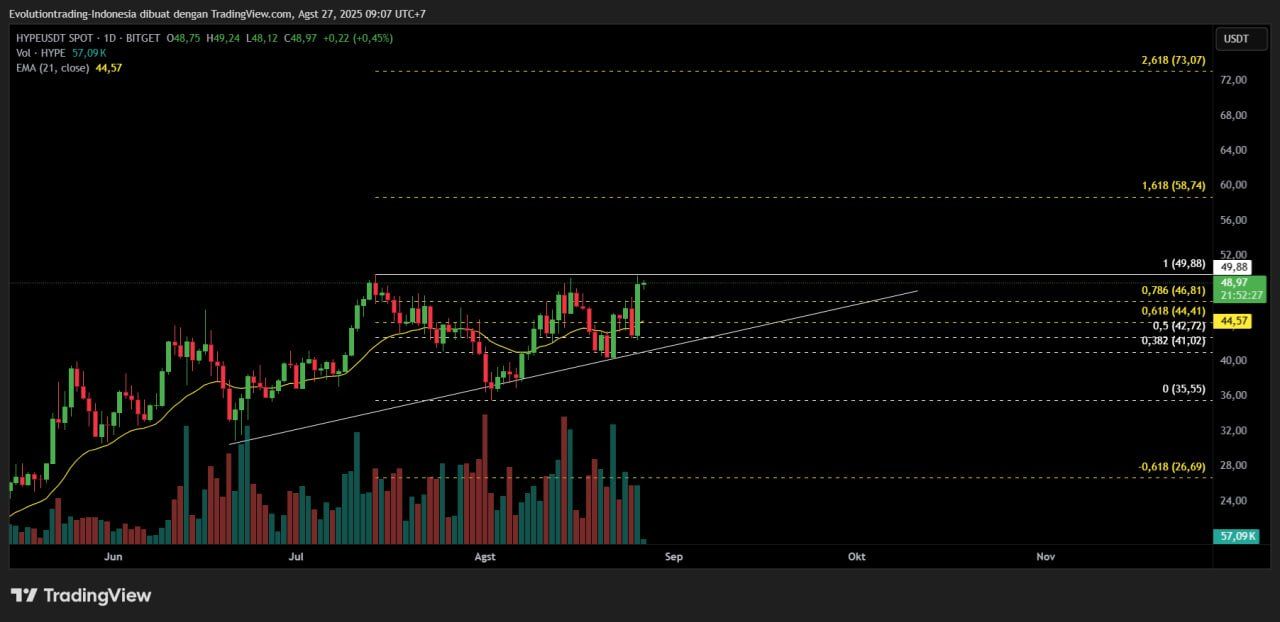 На великих таймфреймах сигнали імпульсу свідчать про те, що HYPE може просунутися до розширень Фібоначчі 1,618 і 2,618, приблизно до 58 і 73 доларів. Цей прогрес залежить від збереження ралі та відсутності ведмежої дивергенції.